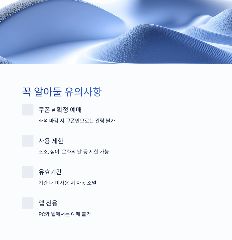 - 예매 전 좌석이 모두 마감되면 쿠폰은 소용 없습니다