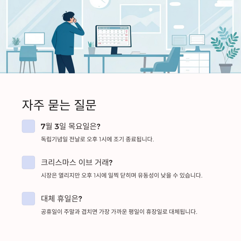 → "공휴일이 주말과 겹치면 가장 가까운 평일이 휴장일로 대체됩니다."