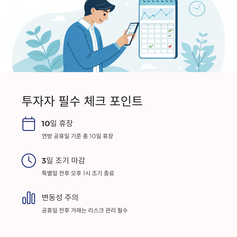 특히 공휴일 전후의 거래는 평소보다 민감하게 움직일 수 있어, 매매 타이밍 조절과 리스크 관리가 중요합니다.