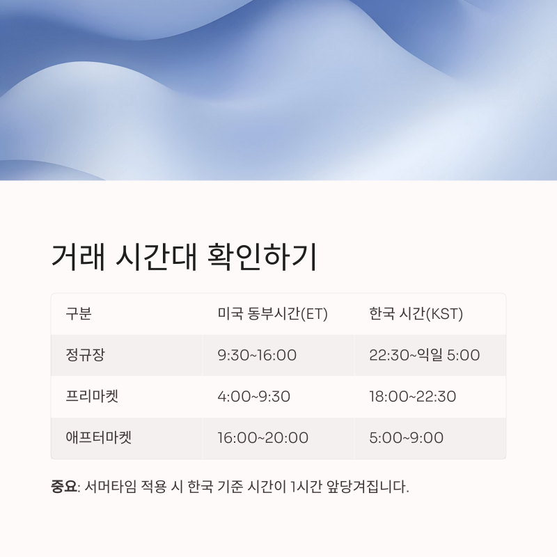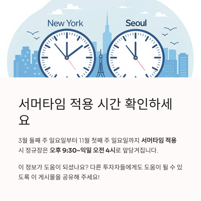 단, 현지 시간 기준이므로 한국 시간과 차이를 고려해야 하며, 해외 주식 투자자라면 프리마켓과 애프터마켓 시간도 알아두는 것이 좋습니다.