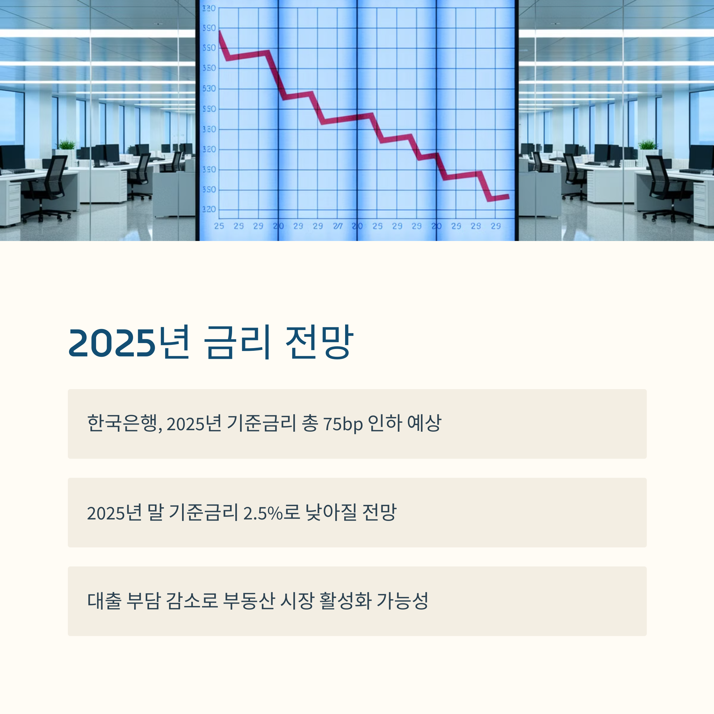 2025년 부동산 시장을 둘러싼 핵심 변수 중 하나는 금리 정책입니다. 최근 글로벌 경제 상황이 변화하면서 미국과 한국의 기준금리 인하 가능성이 거론되고 있습니다. 금리가 내려가면 대출 부담이 줄어들어 부동산 시장에 긍정적인 영향을 줄 수 있습니다. 하지만, 금리 인하가 무조건 집값 상승으로 이어지지는 않습니다. 공급량, 수요 변화, 정책적 요인이 함께 작용해야 상승세가 유지될 수 있습니다.