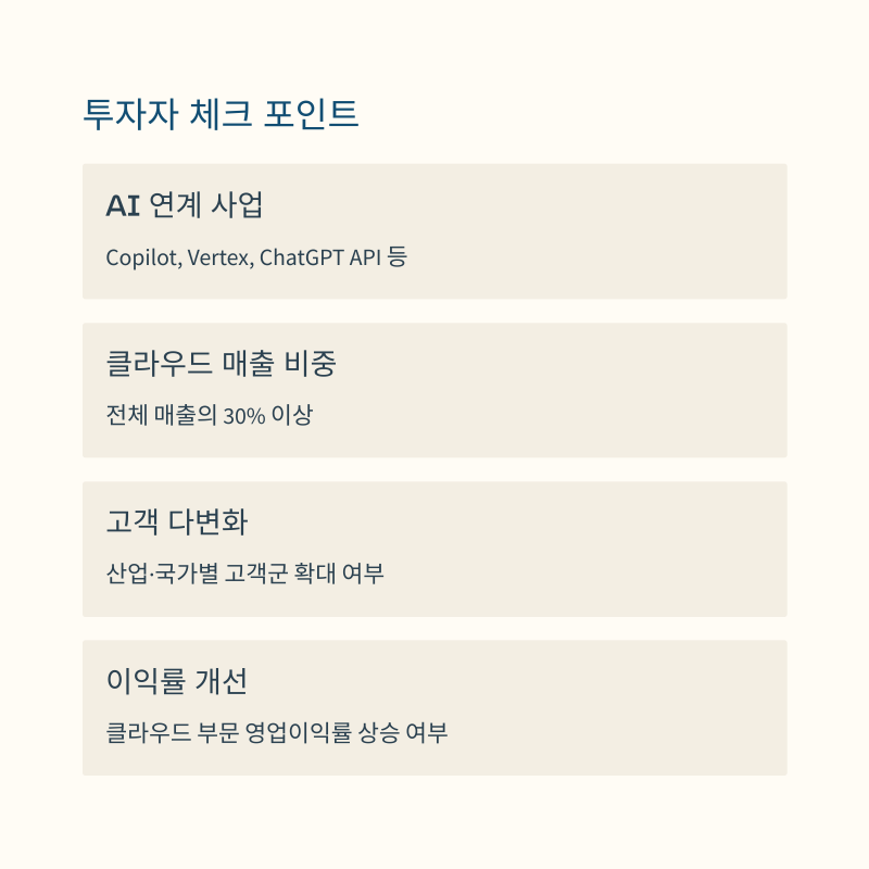 단순히 클라우드 기업이라는 이유만으로 투자하기보다는 다음과 같은 기준으로 기업을 선별하는 것이 유효합니다.