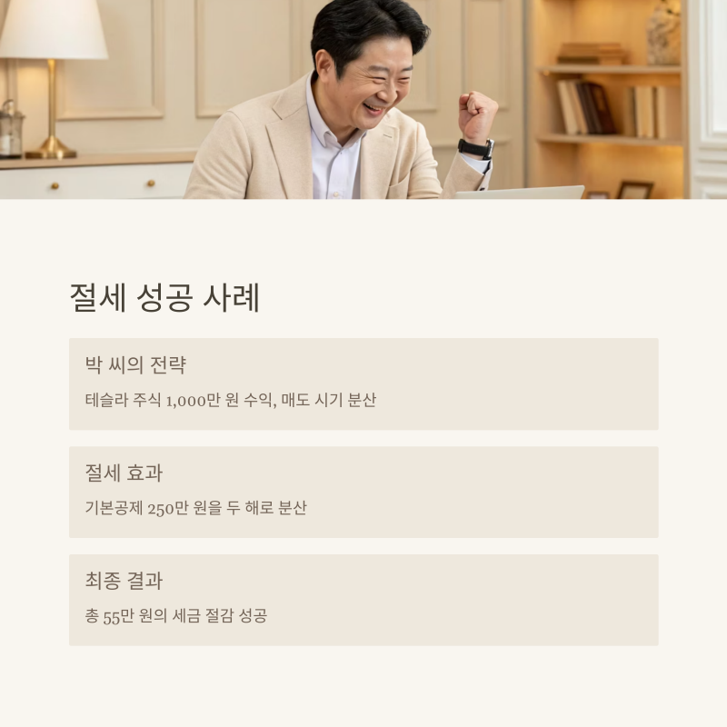 이유는 단 하나, 기본공제 250만 원을 두 해로 분산해 총 55만 원의 세금을 아꼈기 때문입니다."