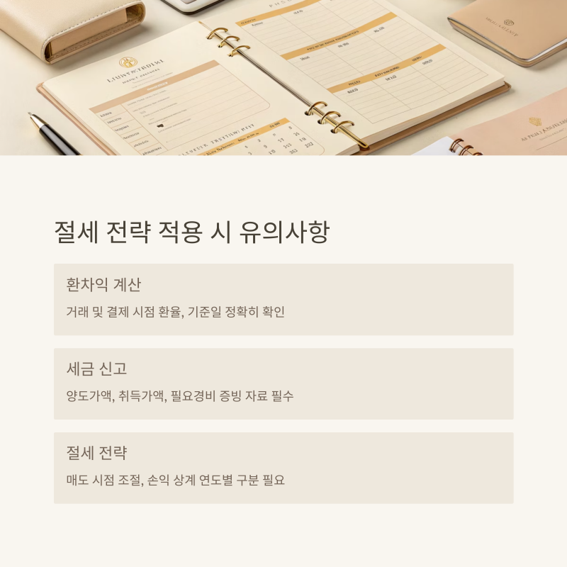 | 절세 전략 | 매도 시점 조절, 손익 상계 | 연도별 구분 확실히 해야 함 |
