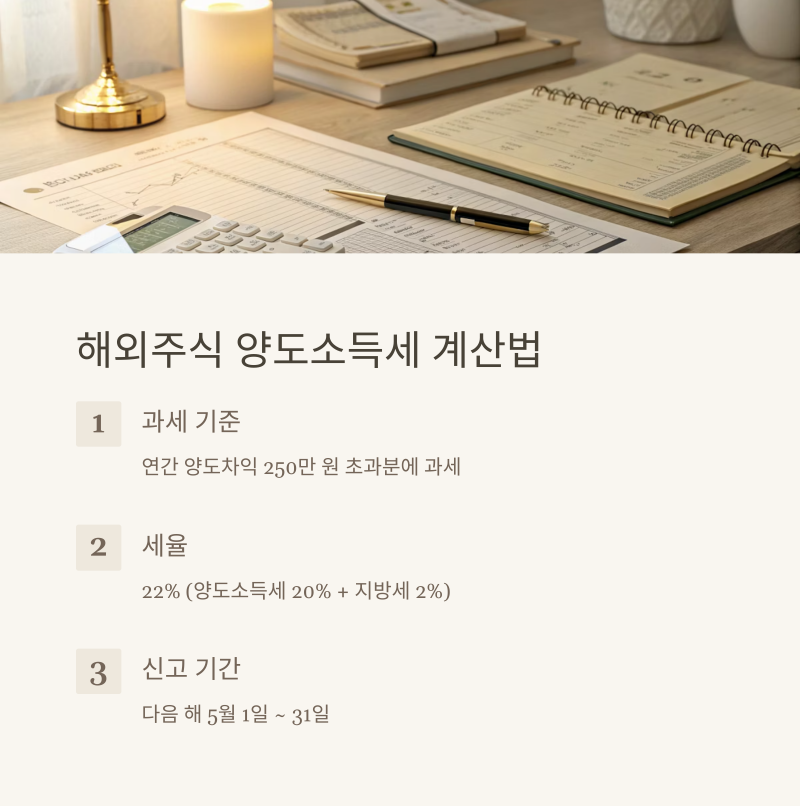 2025년 기준, 해외주식 양도차익이 연간 250만 원을 초과할 경우 초과 금액에 대해 20% 양도소득세와 2% 지방소득세가 부과됩니다.
