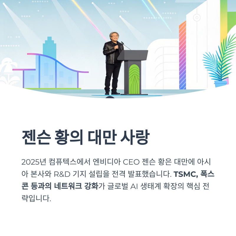 2025년 컴퓨텍스에서 엔비디아 CEO 젠슨 황은 대만에 아시아 본사와 R&D 기지 설립을 전격 발표했습니다.