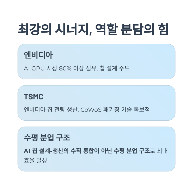 AI 칩 설계-생산의 수직 통합이 아닌 수평 분업 구조로, 양사 모두 최대 효율을 달성하고 있습니다.