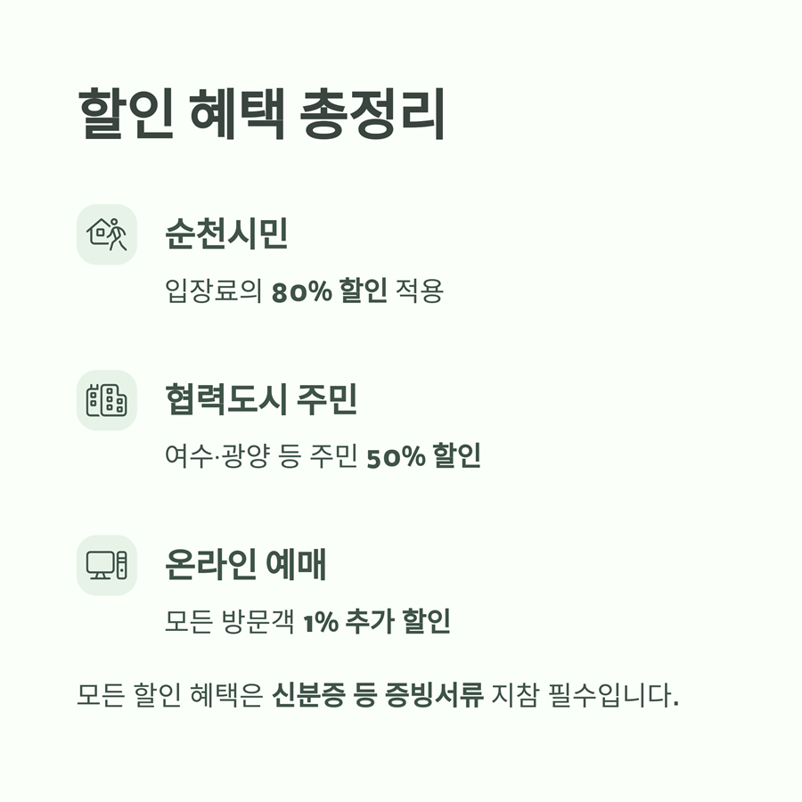 순천 외에도 아래 협력 도시 주민에게는 50% 할인 혜택이 적용됩니다.