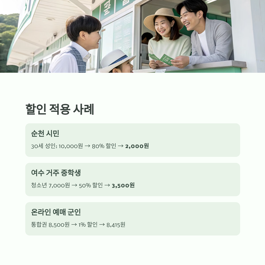 - 사례 1 : 순천에 거주하는 30세 시민 → 성인 10,000원 → 80% 할인 → 2,000원