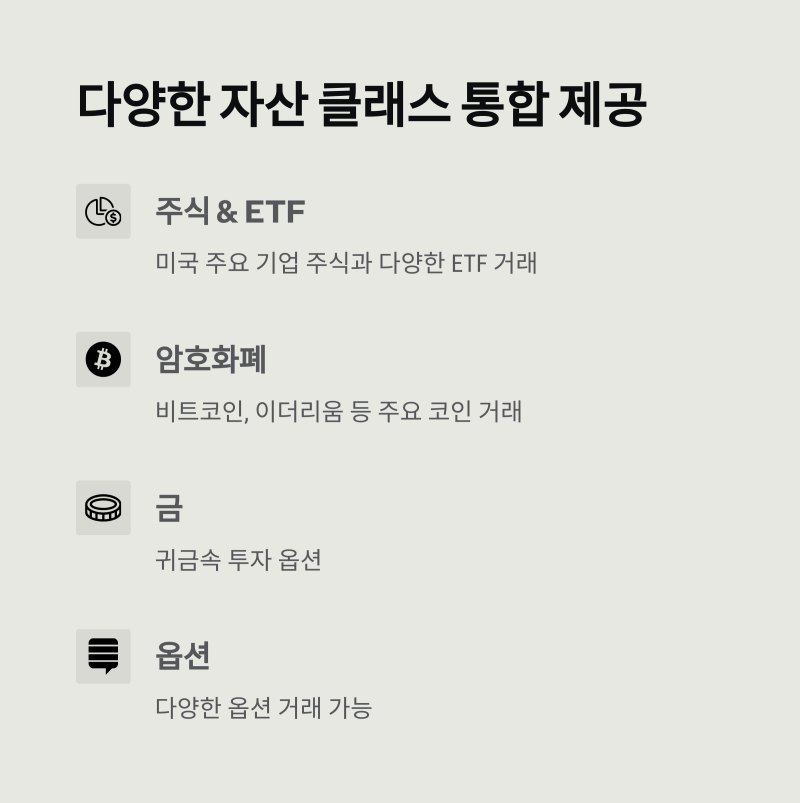 | 주요 서비스 | 주식, ETF, 옵션, 암호화폐, 금 |