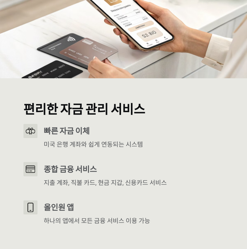 또한 지출 계좌, 직불 카드, 현금 지갑, 신용카드 서비스 등 하나의 앱에서 종합 금융서비스를 누릴 수 있다는 점도