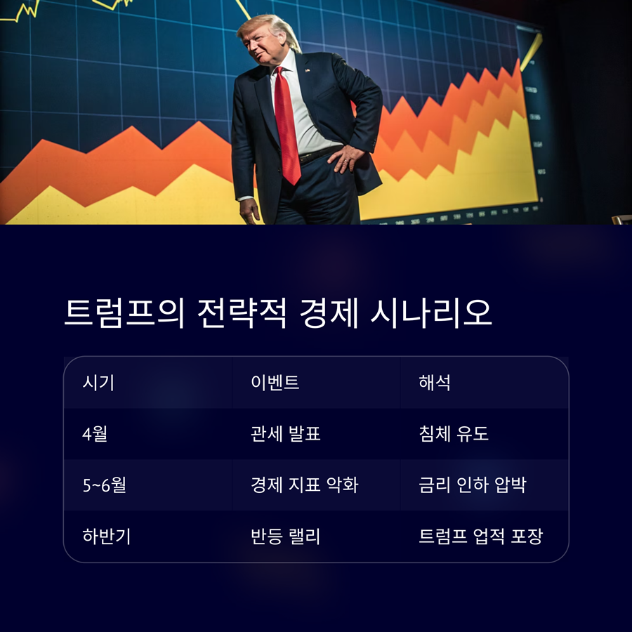 "지금 침체는 전정부 탓, 하반기 회복은 트럼프의 업적"이라는 시나리오로, 상반기 악재를 소진한 뒤 하반기 강력한 경제 회복 프레임을 구축하려는 의도가 뚜렷합니다.