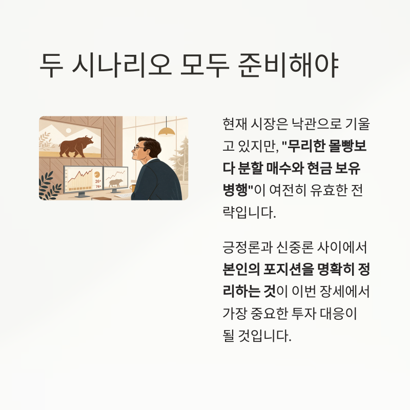 현재 시장은 분명 낙관으로 기울고 있지만, "무리한 몰빵보다 분할 매수와 현금 보유 병행"이 여전히 유효한 전략입니다.