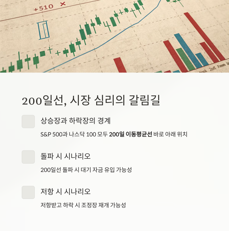 S&P 500과 나스닥 100 모두 200일 이동평균선 바로 아래에 위치해 있습니다.
