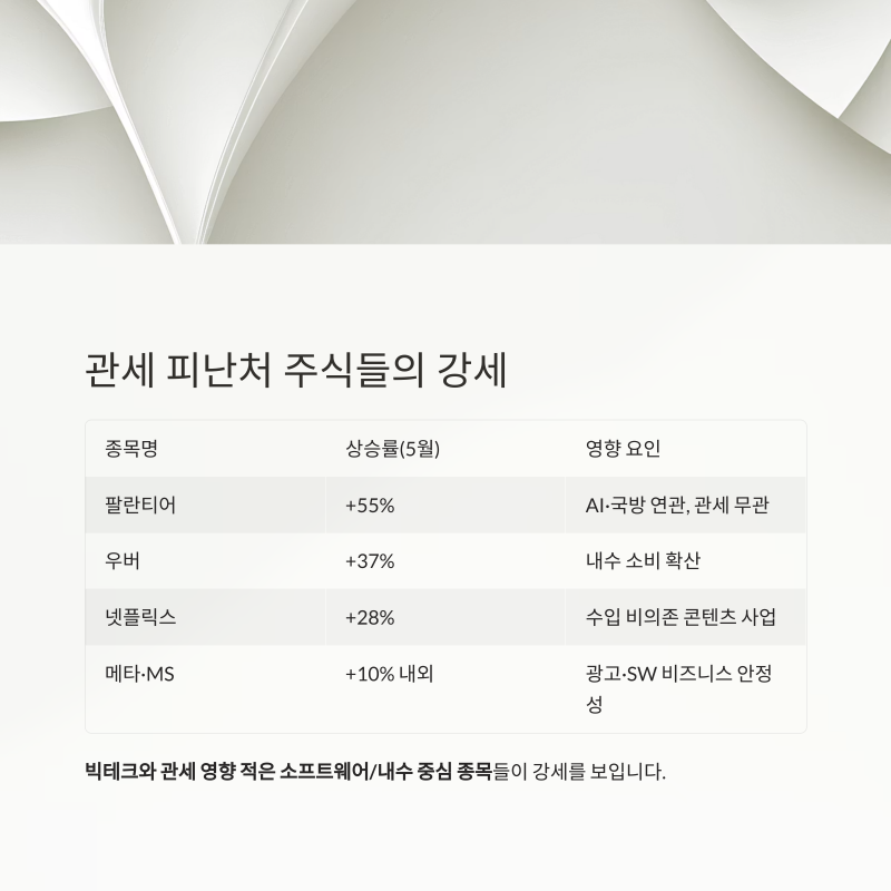 | 팔란티어 | +55% | AI·국방 연관, 관세 무관 |