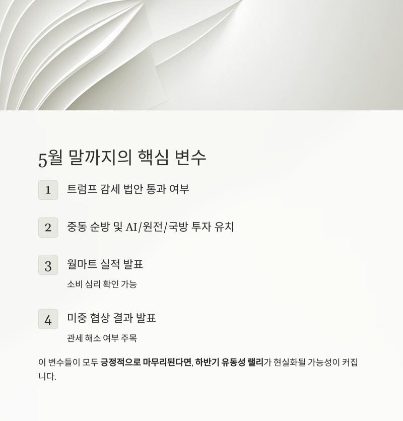 이 변수들이 모두 긍정적으로 마무리된다면, 하반기 유동성 랠리가 현실화될 가능성이 커집니다.
