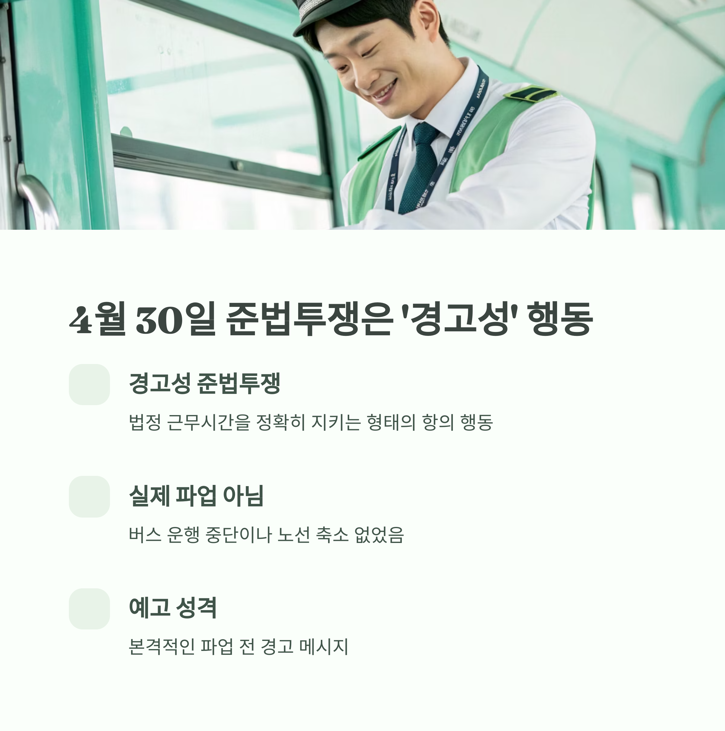 경고성 준법투쟁은 운전기사들의 법정 근무시간을 정확히 지키는 형태의 항의 행동으로,