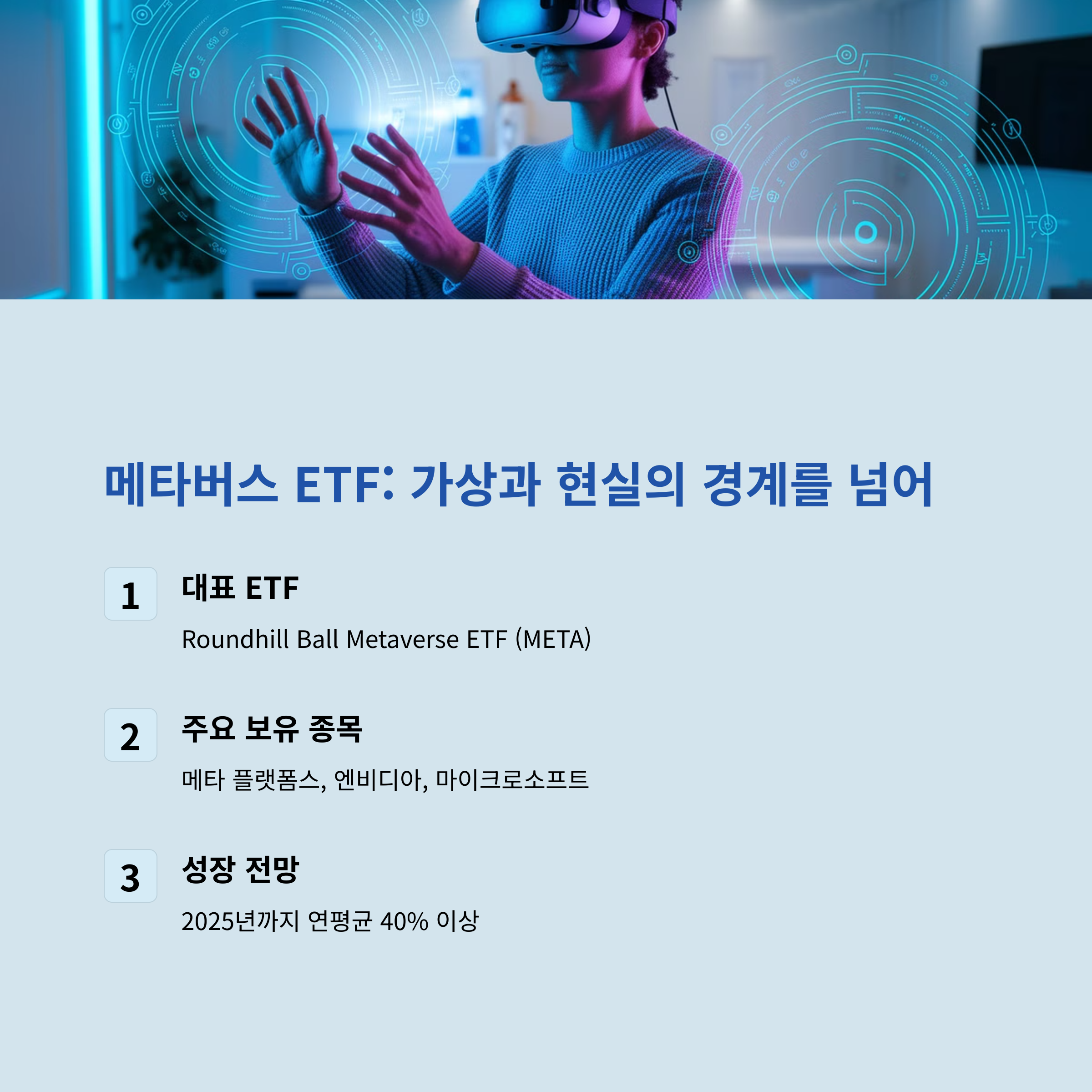 메타버스 ETF도 빠질 수 없습니다. 페이스북(현 메타)의 메타버스 프로젝트 이후로 가상 현실(VR)과 증강 현실(AR)에 대한 관심이 급증했습니다. 메타버스 관련 ETF는 게임, 소셜 네트워크, 가상 경제와 같은 다양한 분야에서 활용될 수 있으며, 대표적인 ETF로는 Roundhill Ball Metaverse ETF(META)가 있습니다. 장기적인 성장 가능성이 높아, 투자자들에게 유망한 선택지가 될 것입니다.