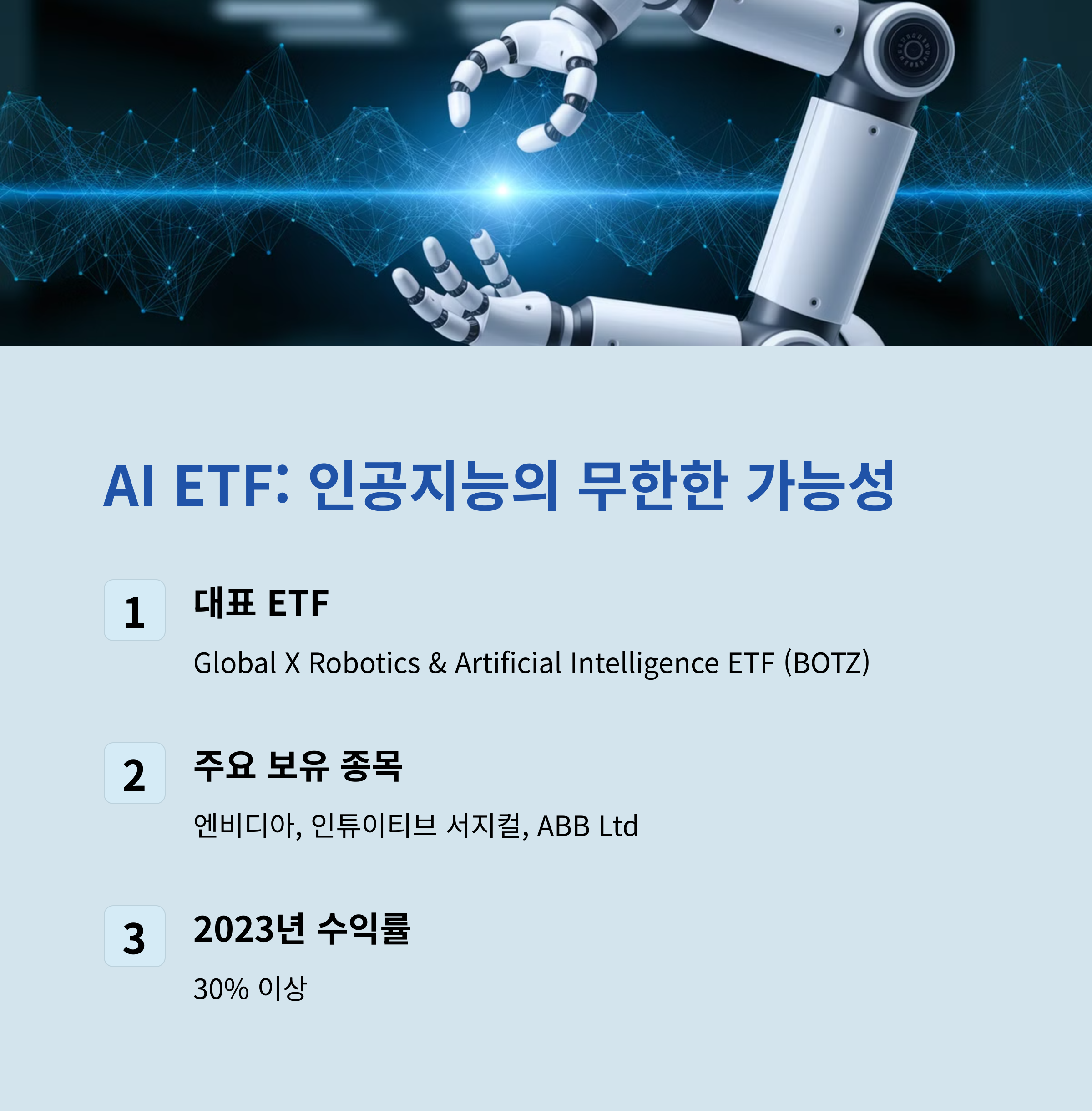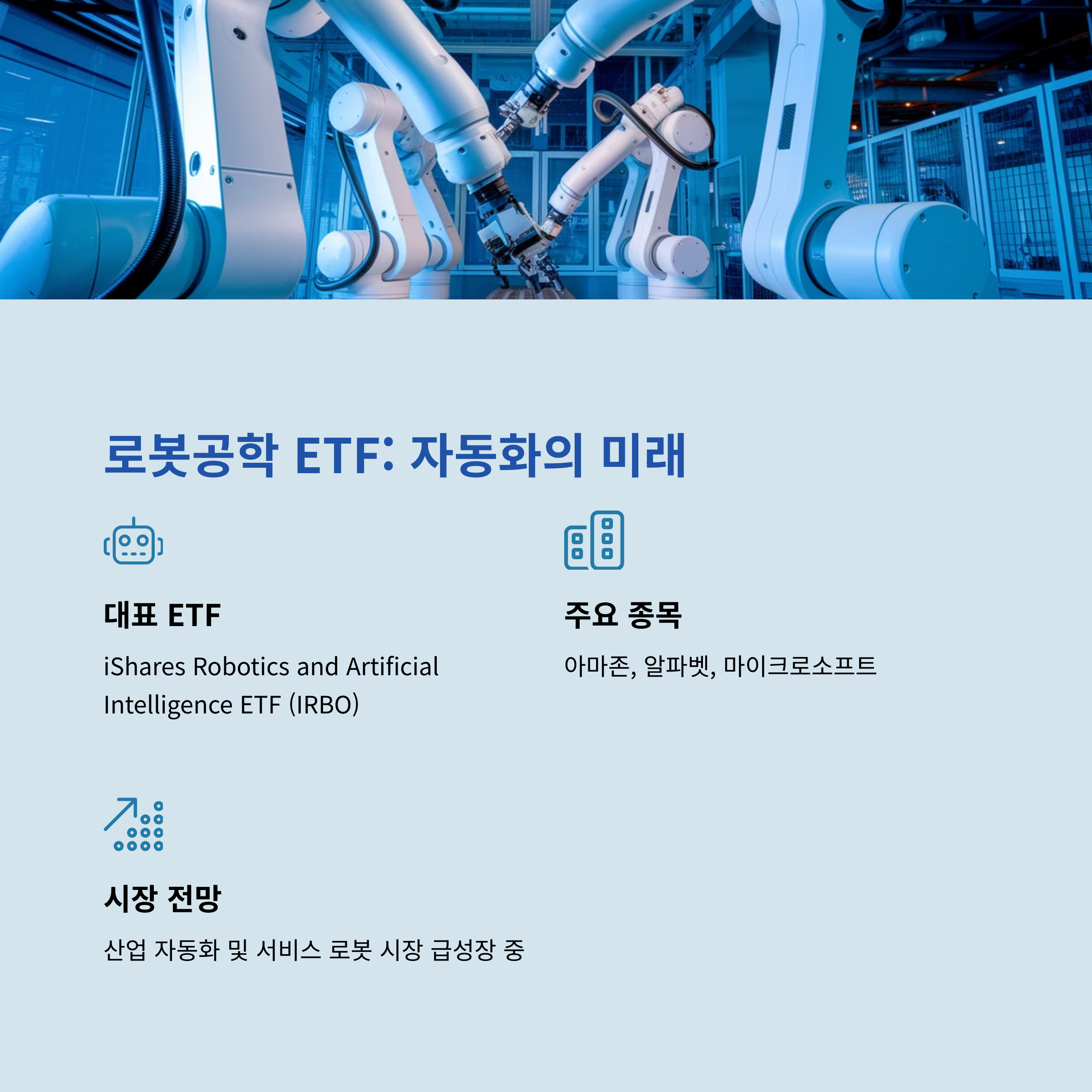 가장 주목해야 할 것은 AI ETF입니다. AI 기술은 이미 우리 생활 속에 깊숙이 자리 잡고 있으며, 앞으로도 그 영향력은 더욱 커질 것입니다. 자율주행, 챗봇, 데이터 분석, 로봇 산업 등 다양한 분야에서 AI가 활용되면서 AI 관련 ETF의 가치도 함께 상승할 것으로 예상됩니다. 대표적인 AI ETF로는 ARKQ(ARK Autonomous Technology & Robotics ETF)가 있으며, AI 및 자동화 기술을 주도하는 기업들에 투자할 수 있습니다.