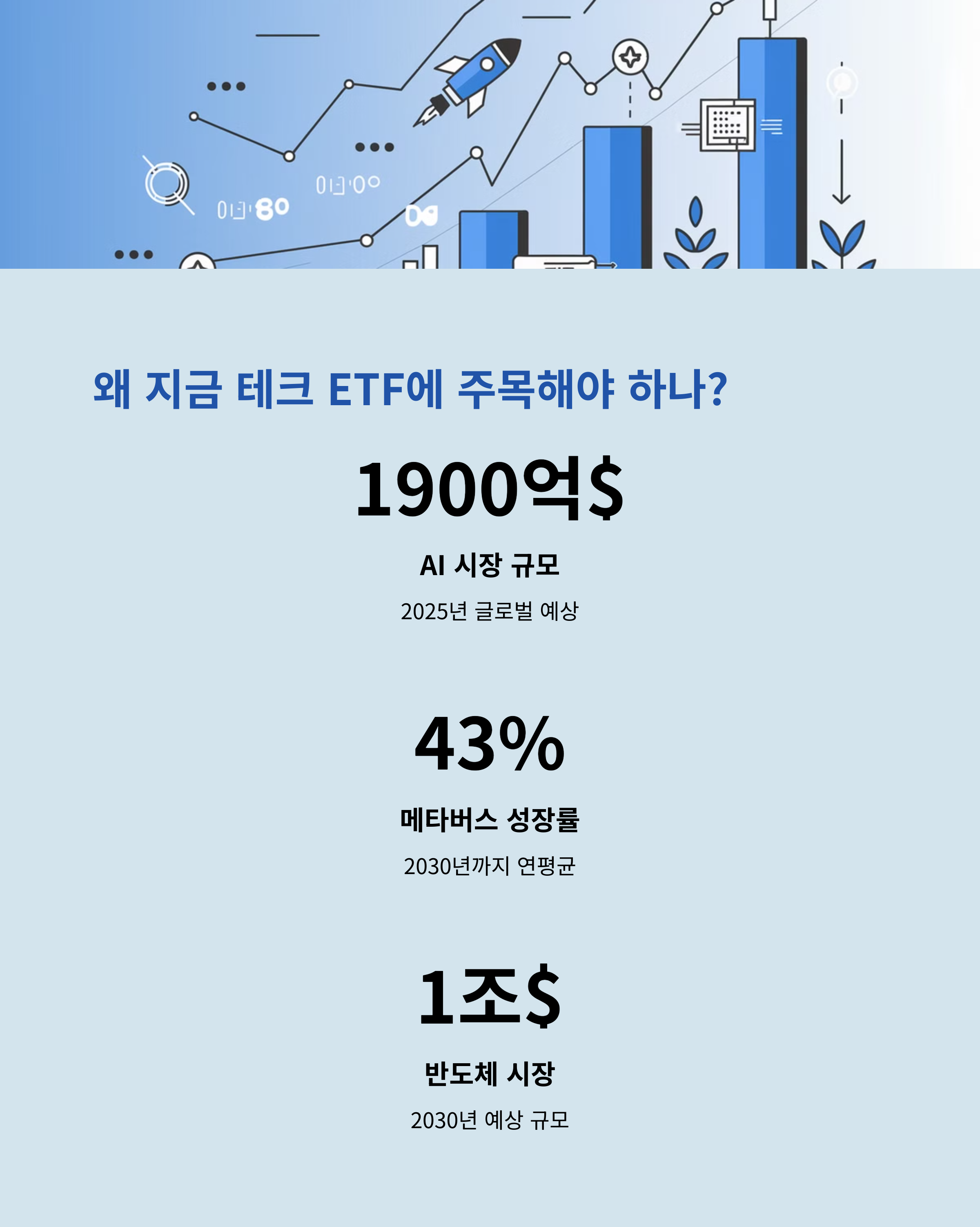 테크 ETF에 대한 관심이 증가하는 이유는 단순합니다. 기술 산업은 빠르게 성장하고 있으며, 혁신적인 기업들이 등장하면서 장기적인 투자 수익을 기대할 수 있기 때문입니다. 특히, AI, 메타버스, 반도체와 같은 분야는 앞으로도 시장을 주도할 가능성이 높아, 장기적인 관점에서 매우 매력적인 투자 대상입니다. ETF는 개별 주식보다 위험을 분산할 수 있어 보다 안정적인 투자 방식을 원하는 분들에게 좋은 선택이 될 수 있습니다.