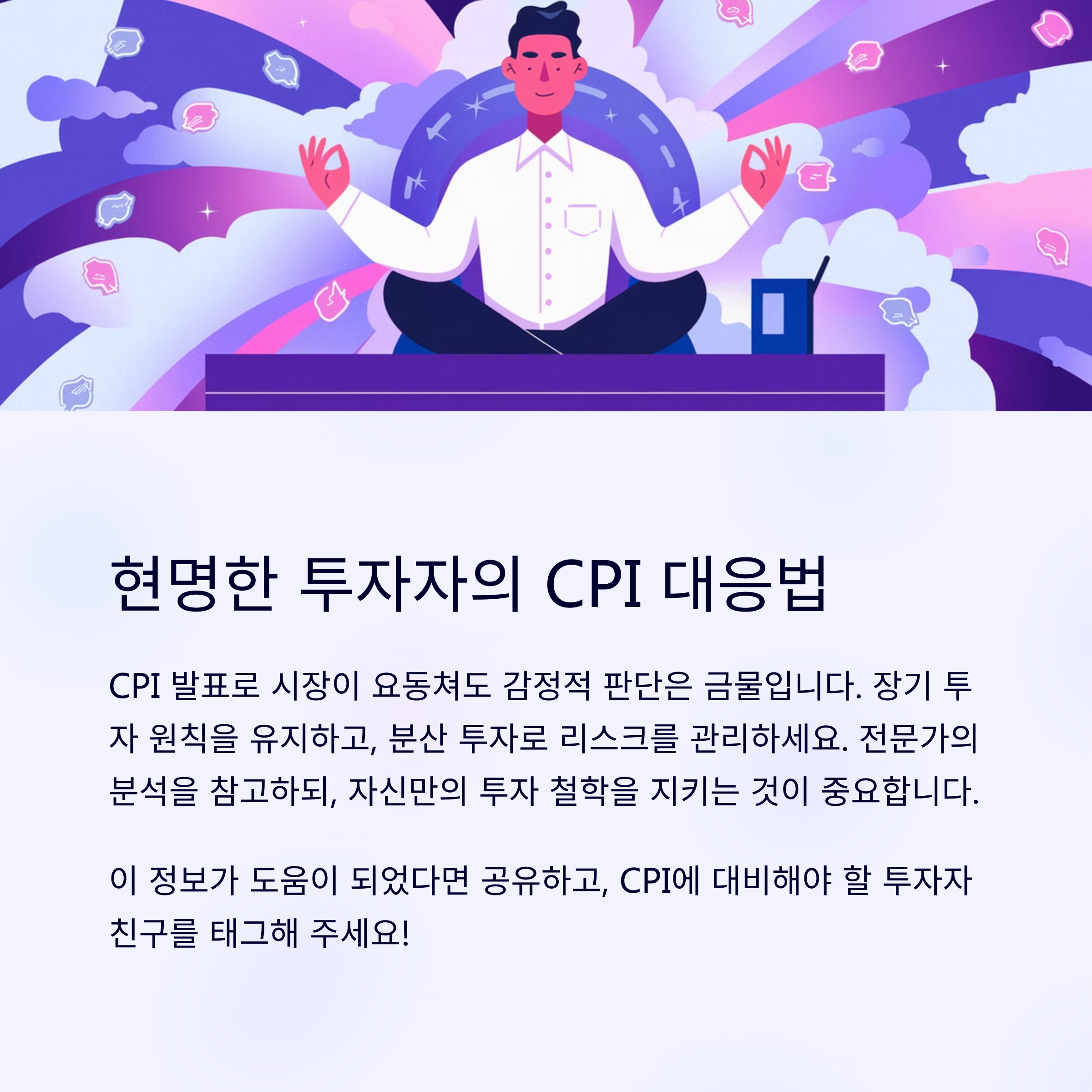 CPI 발표일은 단순한 숫자 이상의 의미를 가지고 있습니다. 투자자는 이를 통해 시장의 심리, 향후 금리 방향성, 각종 자산의 민감도를 예측할 수 있습니다. 하지만 중요한 것은 이러한 정보를 맹목적으로 따라가기보다 자신의 기준과 투자 전략에 따라 해석하고 대응하는 자세입니다. 매달 반복되는 경제 이벤트 속에서도 흔들리지 않는 자신만의 원칙을 세워가는 것이 결국 장기적으로 살아남는 투자자의 길이 될 것입니다.