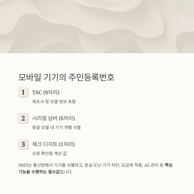 IMEI는 통신망에서 기기를 식별하고, 분실·도난 기기 차단, 요금제 적용, AS 관리 등 핵심 기능을 수행하는 필수값입니다.