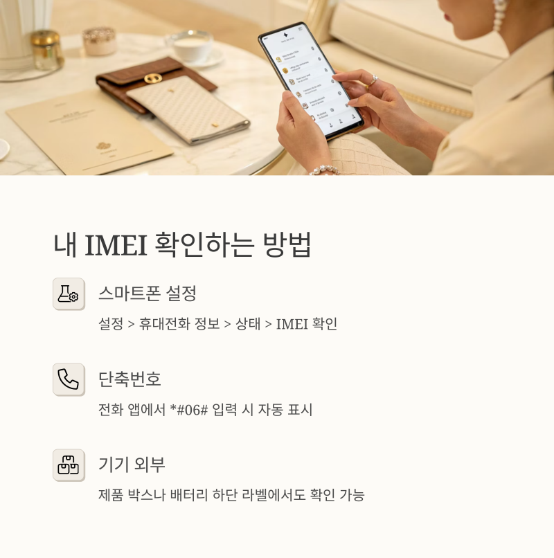 스마트폰에서 직접 확인하거나, 제품 박스에서도 IMEI를 손쉽게 찾을 수 있습니다.