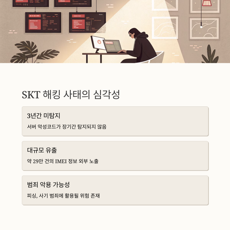 2025년 5월, SKT는 3년간 탐지되지 않은 서버 악성코드로 인해 대규모 해킹 사고를 겪었습니다. 이로 인해 유심 정보(IMSI), 이메일, 생년월일 등과 함께 약 29만 건의 IMEI 정보가 포함된 파일이 외부에 노출됐습니다.