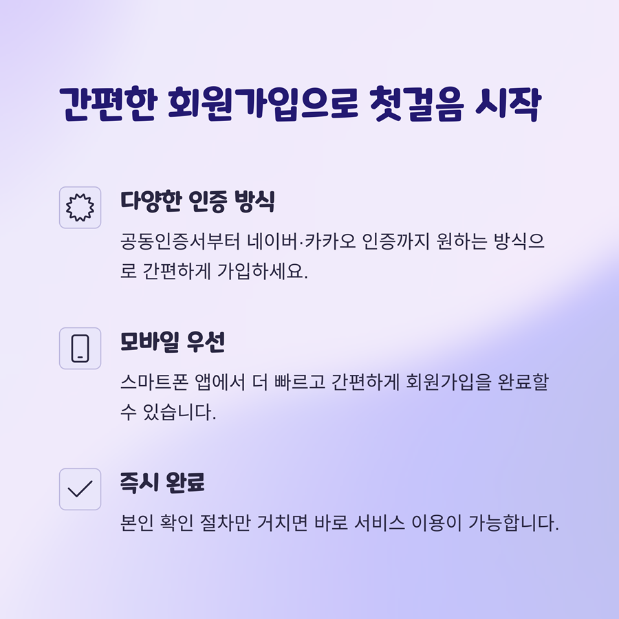 처음 가입하는 분들은 인증 수단을 준비하고, 간편하게 본인 인증 후 가입을 완료할 수 있습니다.