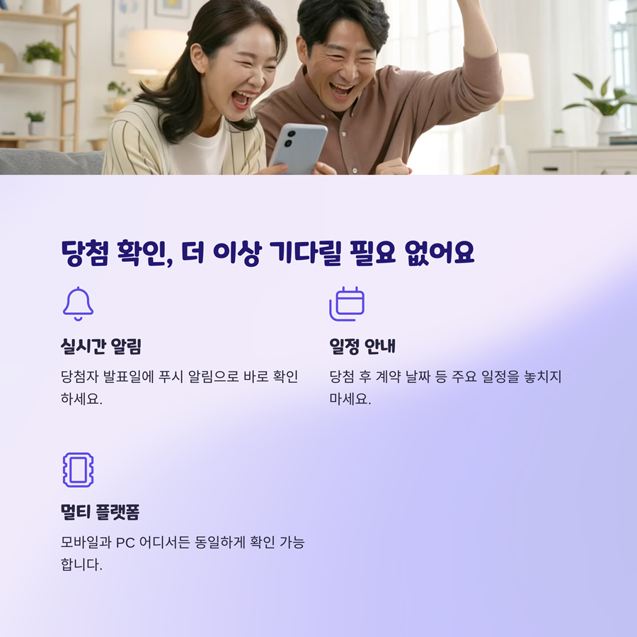 앱에서는 알림 설정, 관심 공고 저장, 일정 관리 기능까지 제공되어 청약 관리를 한층 편리하게 만들어줍니다.