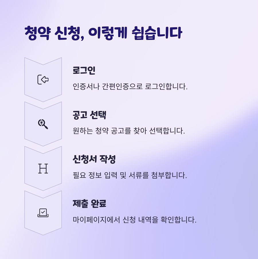 청약 신청은 로그인 후 자동 자격 검토, 신청서 작성, 제출 순으로 이루어집니다.