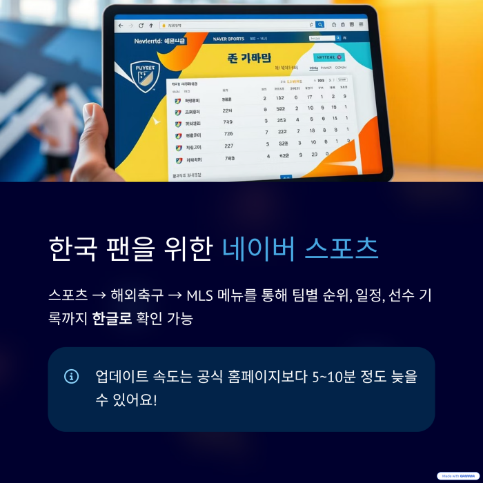 스포츠 → 해외축구 → MLS 메뉴를 통해 팀별 순위, 일정, 선수 기록까지 볼 수 있으며, 한글로 제공되는 점이 큰 장점입니다.