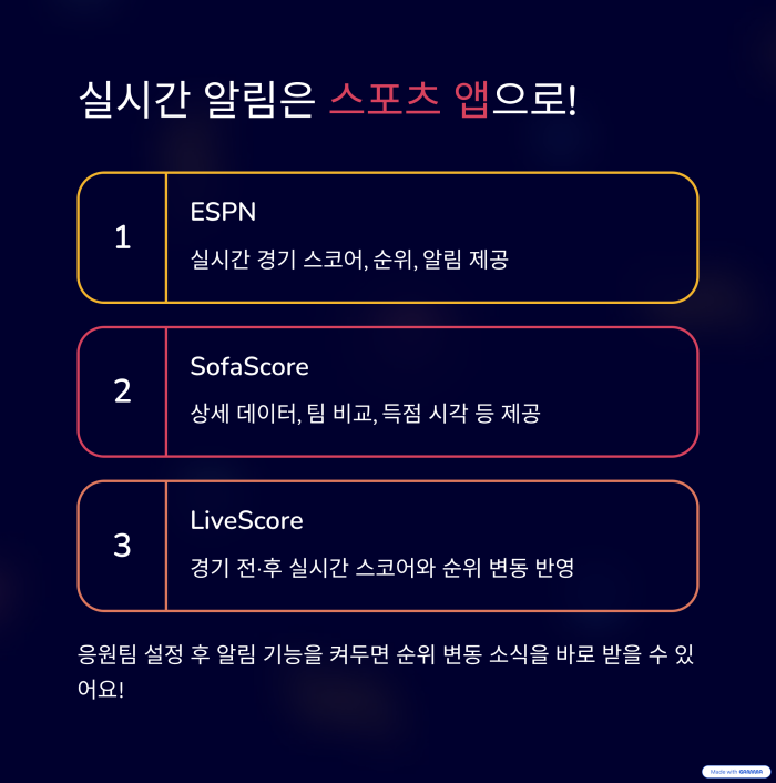| 실시간 알림 받고 싶을 때 | ESPN, SofaScore, LiveScore 앱 |