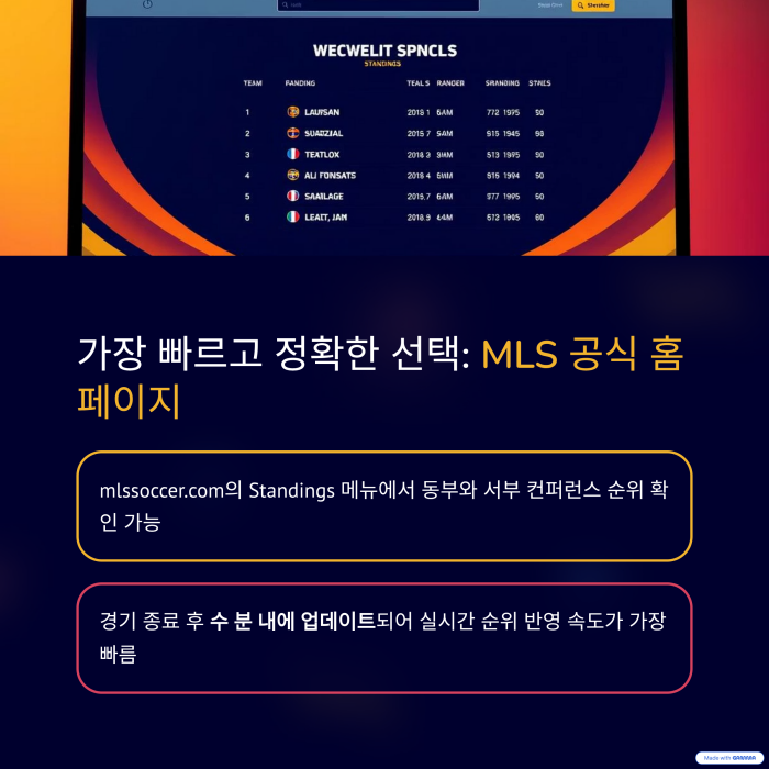 MLS 순위 확인의 가장 신뢰도 높은 경로는 단연 MLS 공식 홈페이지(mlssoccer.com)입니다.