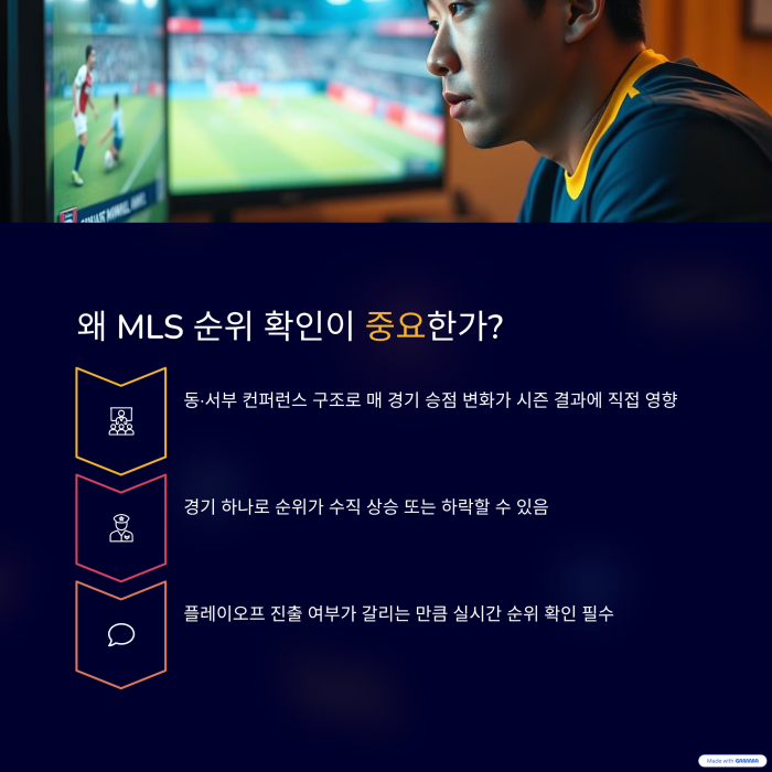 MLS는 동·서부 컨퍼런스로 나뉜 리그 구조와 플레이오프 시스템으로 인해 매 경기 승점 변화가 시즌 결과에 직접적 영향을 줍니다.