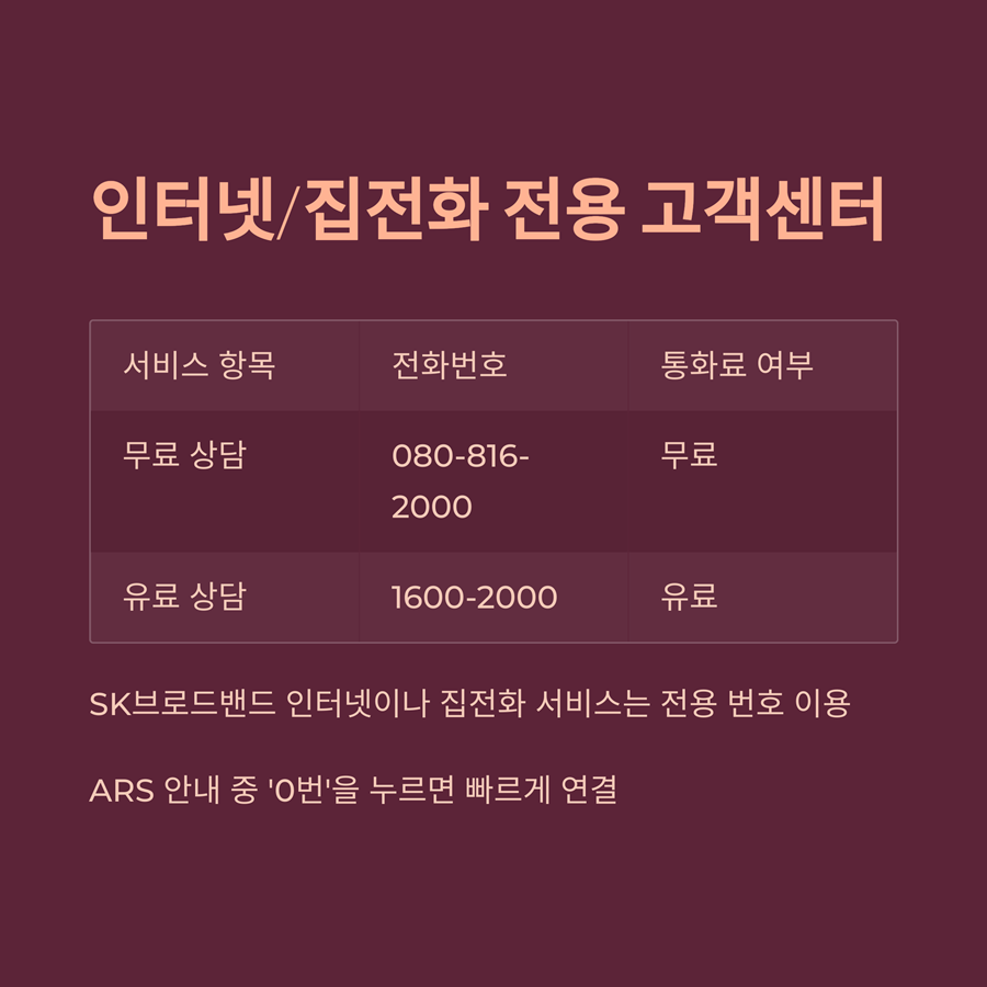 예를 들어 SK브로드밴드 인터넷이나 집전화 서비스는 아래와 같은 전용 번호가 존재합니다: