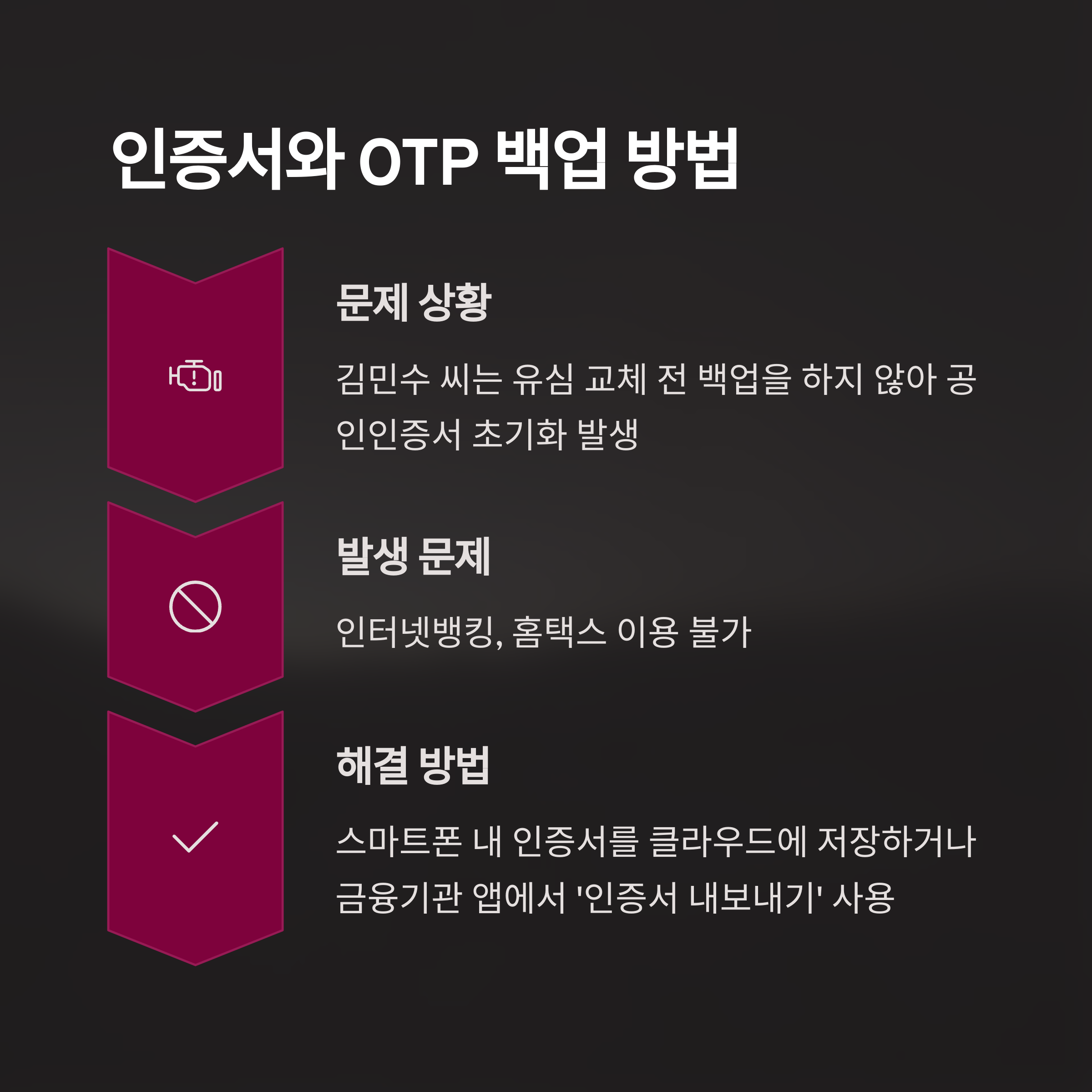 • 상황: 김민수 씨는 유심 교체 전 백업을 하지 않아 공인인증서 초기화 발생