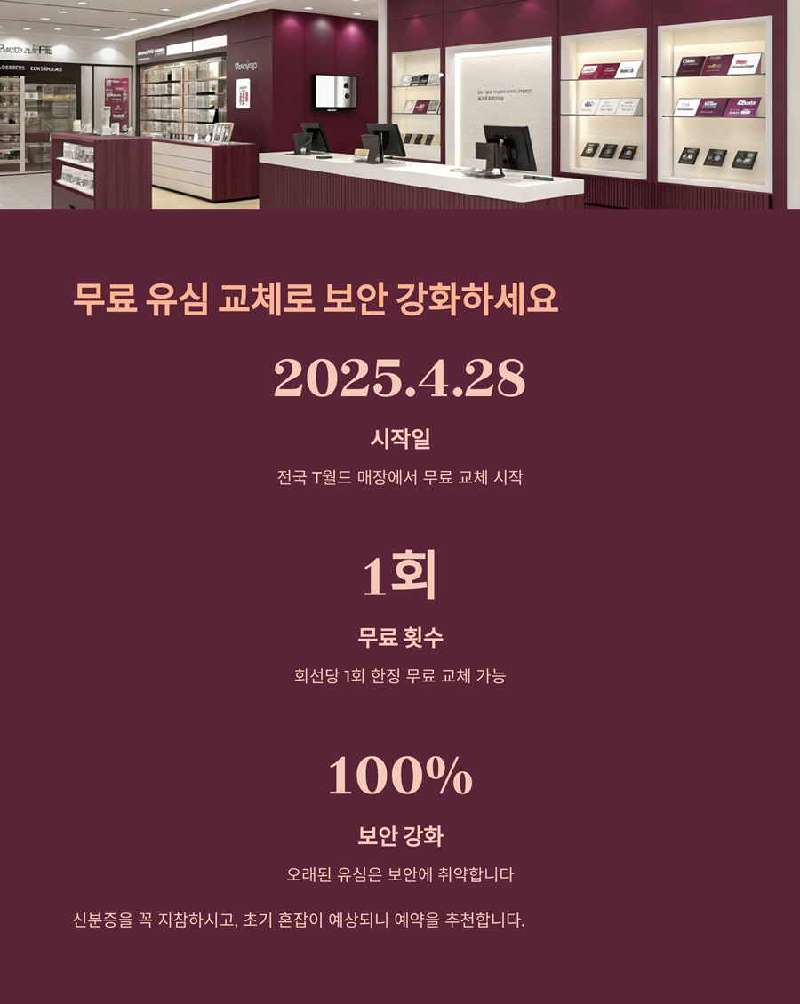 2025년 4월 28일부터 전국 T월드 매장에서 유심 무료 교체를 진행 중입니다.